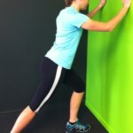 Standing with one foot forward and one foot back. The hands are positioned on the wall as shown.